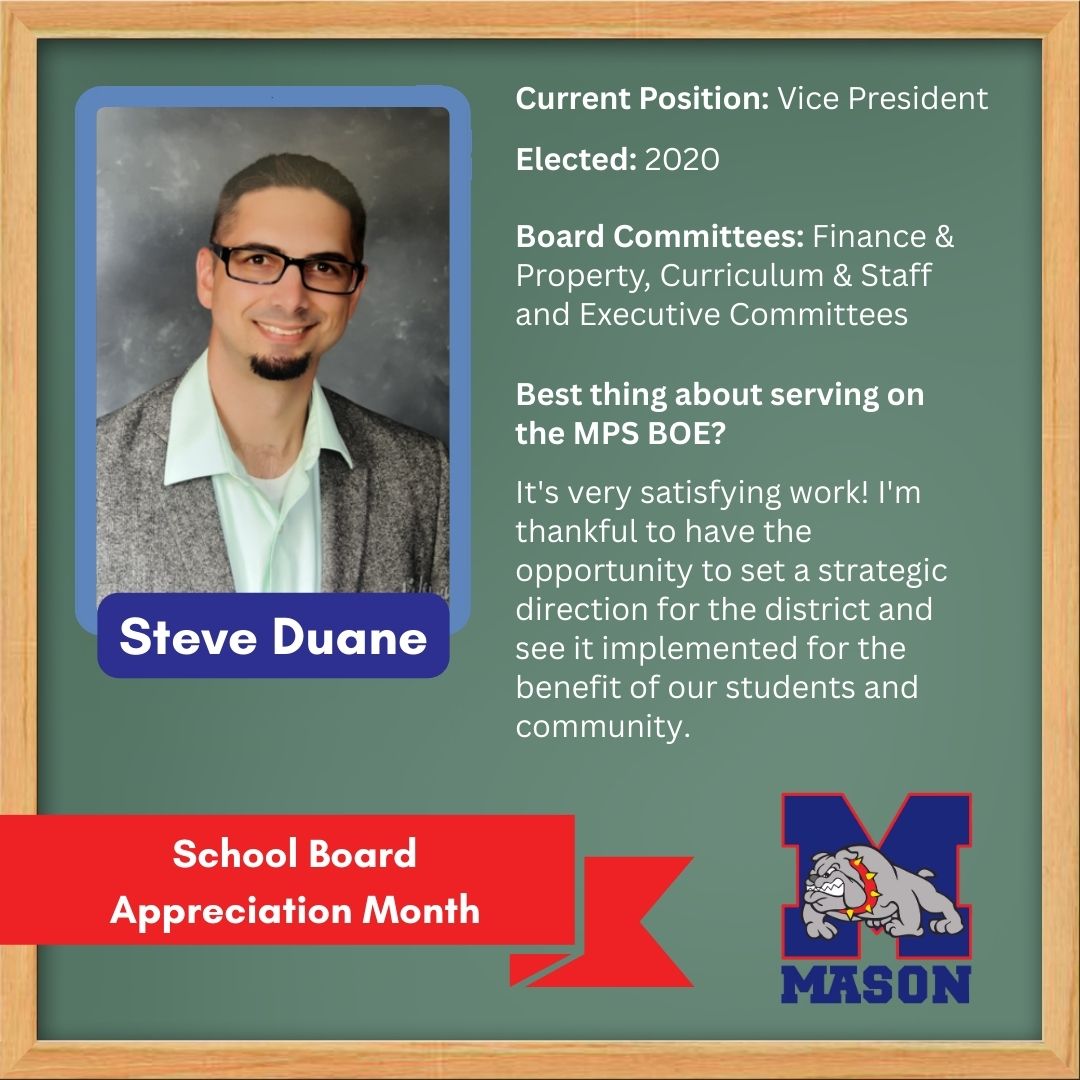 Elected: 2016; Board Committees: Policy & Community, Executive Committees; What does success for MPS look like to you? Students and families continuing to move here and graduate from MHS. Coming to Mason and staying is a true indicator that the schools are doing well.