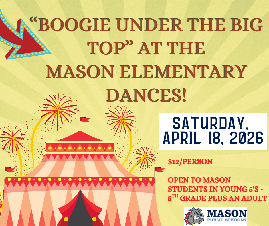 Mason Elementary students and their favorite adult are invited to a night of circus fun at the Elementary Dances! The dances will be Saturday, April 18, 2026, in the Mason Middle School gym. Tickets are $12 ticket and available